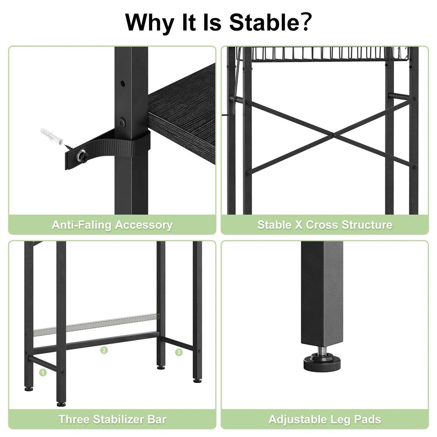 • The metal frame is incredibly strong and corrosion-resistant which ensures the stability and durability of the shelf. The height-adjustable X-shaped bar design at the back of the bracket improves the stability of the frame and makes the toilet rack more suitable for different heights of toilet inlet pipes.