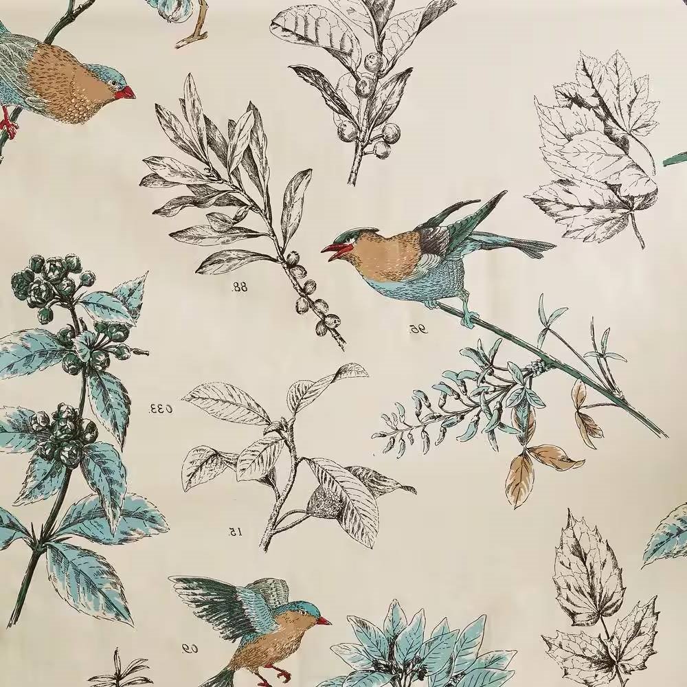 • 72-inch Beige Khaki Cotton Shower Curtain with Vintage Birds Leaf Floral Print