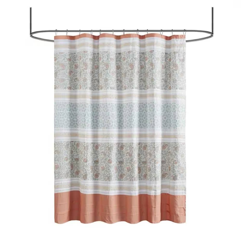 For a charming and stylish touch to your bathroom, this 72 x 72-inch Cotton Shower Curtain with Coral Orange Blue White Paisley Pattern holds all of the perfect elements to do shabby chic the right way. A mixture of coral, orange, and hints of green are printed in a paisley design alongside pin tucked white fabric that is separated by beautiful lace taping. Finished with 12 button holes at the top makes this shower curtain easy to assemble hooks and simply hang on any standard rod (hooks and rod not included). This shower curtain is also OEKO-TEX certified, meaning it does not contain any harmful substances or chemicals, ensuring quality comfort and wellness. Each shower curtain measures 72x72" and is machine washable for easy care; to keep this shower curtain in the best condition a water repellant liner is highly recommended (liner not included and should be purchase separately).