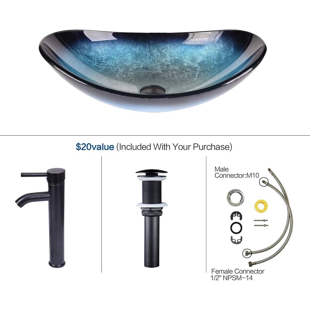This Farmhouse Wood Finish Bathroom Vanity w/ Blue Glass Sink Black Faucet and Drain is made of Eco-MDF wood for long-lasting durability. Careful Coverage and Eco paint enable durability. Cabinet: 19"x 28"x 31.5"(D×W× H); Sink dimension: 21" x 6.3" (W xD); Bowl thickness: 0.5". Scratch-resistant & Polished surface is easy to clean up. Come with Vanity, Glass sink, ORB Faucet, Pop up drain, Hot/ cold lines, and some mounting hardware. Modern and stylish design fit perfectly with most bathroom decor; Easy installation.