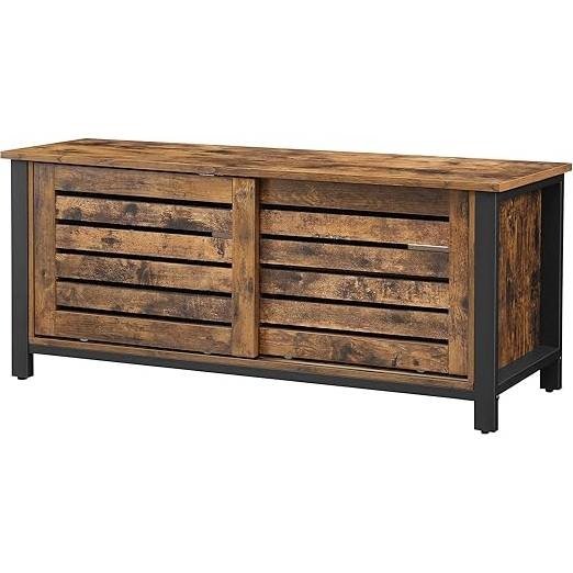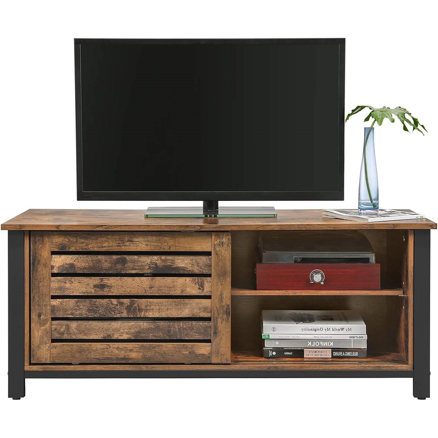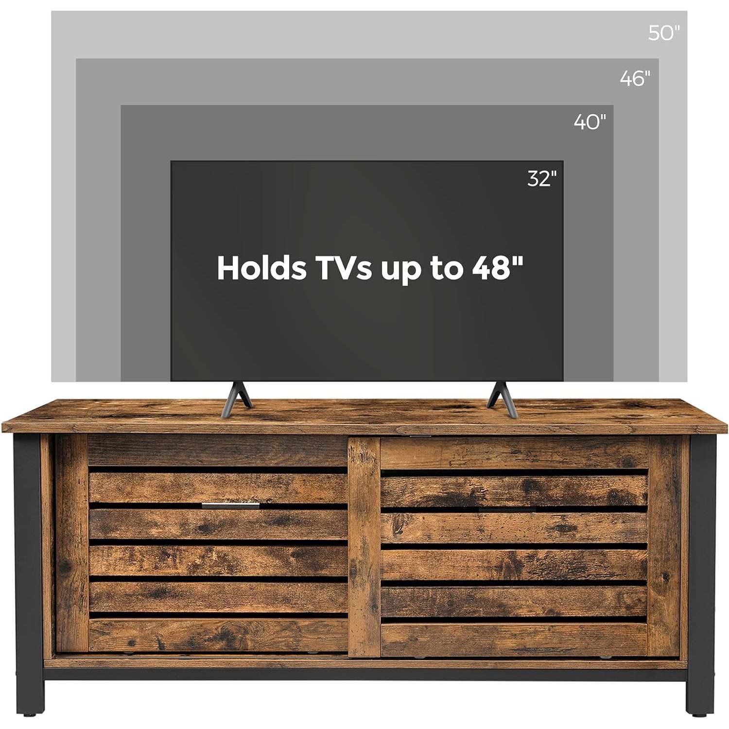 No matter whether you like watching dramas, crime shows or US series, this Farmhouse TV Stand Entertainment Center w/ Sliding Wood Doors for TV up to 50-in positions your TV at the perfect height and is a real eye-catcher just like your TV show due to the black frame and the eye-catching rustic surface. This TV stand impresses us with its two sliding doors with slats that glide gently back and forth on 2 rails. Behind them, 2 shelf levels ensure that you can neatly stow cables, small electrical appliances, or magazines. The robust mix of sturdy iron and hard-wearing engineered wood gives the television table a high degree of stability; load the top with TV sets up to 88 lb; the shelf inside can each be loaded with 33 lb. Use the TV stand not only as a TV table, but also in your bedroom to store bed linen. Or, how about a shoe cabinet in your hallway?All your questions will be answered by our friendly customer service. So equip your living room with this tasteful television cabinet!