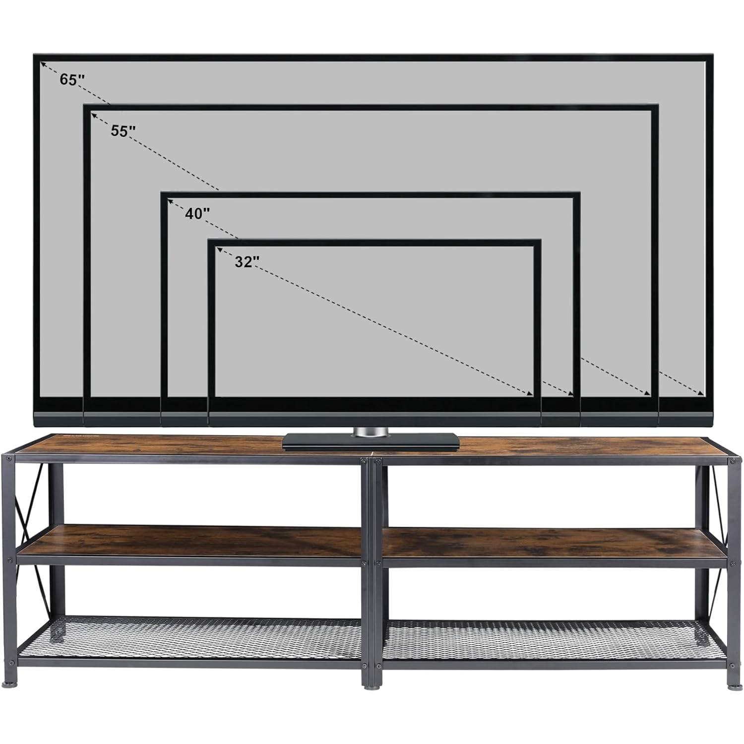 This 55-inch Industrial Style Metal Wood TV Stand for TV up to 65-inch has an overall size 55.1"Wx 15.4"D x 19.7"H which is suitable for TV from 32 to 65 inch. You can also regard it as an mounted television stand. Load capacity for wood shelves is 130LBS while load capacity for grid shelf is 22LBS. Not only does this TV console table elevate your TV, but also regarded as an entertainment center for your DVD collections, game, decorations, etc. Our TV stand is manufactured using advanced laser welding technology. The shelves are composed of only the highest quality engineered wood and laminate insuring a long lifespan and durability. The simple industrial design works well with almost any decor and will never go out of style. It makes an excellent storage/display shelf for your living room as well. Assembly is needed and each part is labeled to help assembly. You don't have to be an expert to set up this TV console table, as we provide you with the illustrated instructions.