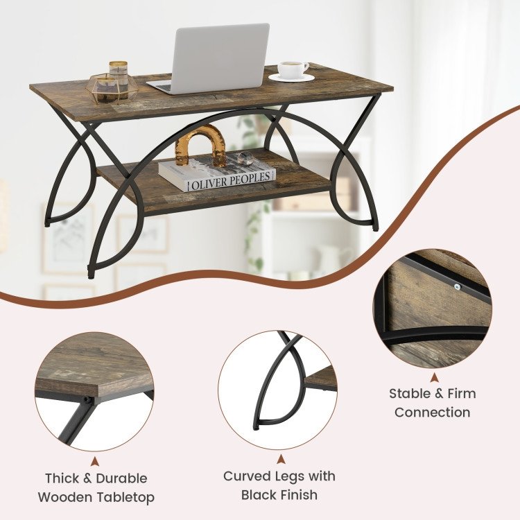 Rustic Farmhouse 2 Tier Brown Wood Coffee Table with Curved Metal Legs