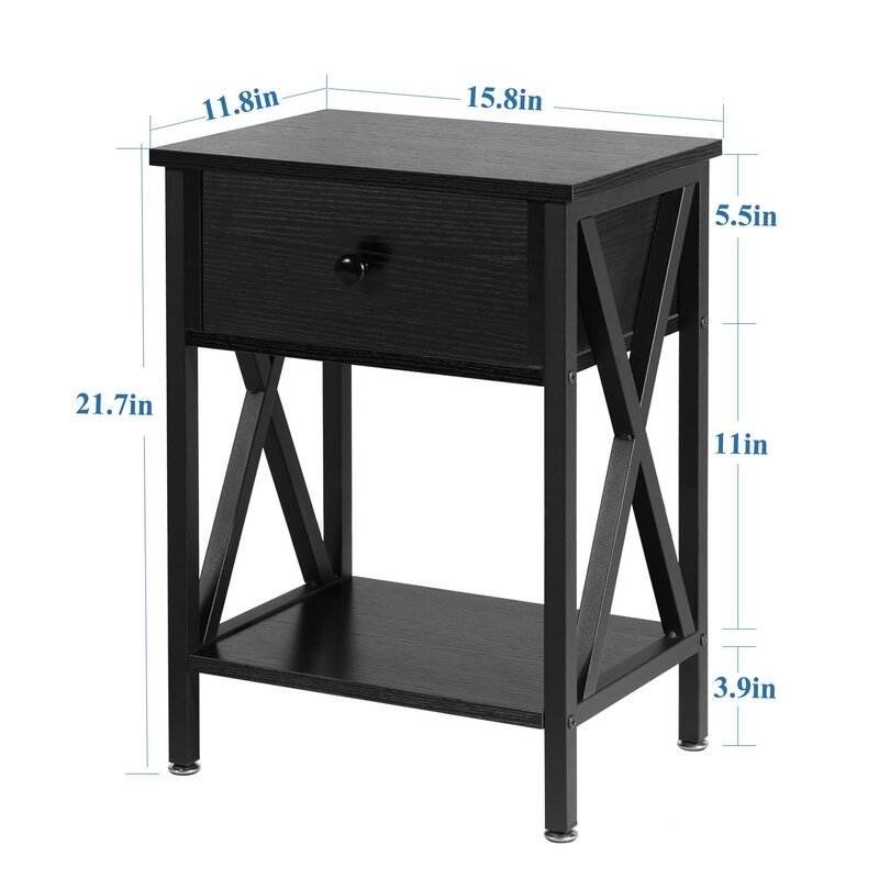 This Rustic 1 Drawer Black Nightstand - Set of 2 showcases a mix of materials for a rustic and traditional look in any home. Each bedside table is made from steel and engineered wood and rests on straight legs with sleek X-shaped accents on the side. The single drawer with a black handle opens to reveal room for essentials like reading glasses and personals. An open shelf is ideal for a stack of books and organizational baskets. This nightstand set features 16" broad surfaces that accommodate a table lamp and a few accent pieces. Simple stylish design options are functional and suitable for any room, sturdy on a flat surface, and easy to assemble with parts and tools included.
