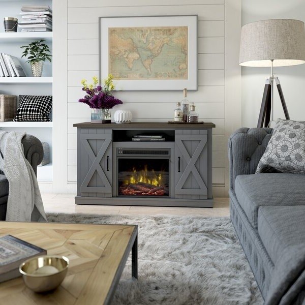 This FarmHouse Rustic Grey/Espresso TV Entertainment Electric Fireplace has a charming, rustic aesthetic and creates a cozy environment in any living room. Each of the 2 cabinets opens to store media players, games, books, and other equipment, while the 3 open shelves give you a place to display your favorite decorative objects. We love how the weathered look of the wood and barn doors add a farmhouse feel to your living room. Plus, a cable management cutout organizes your cords. Fits TVs up to 60''.