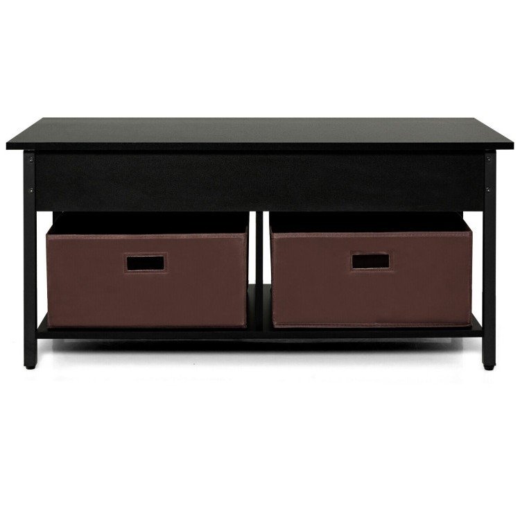 This FarmHouse Black Lift-Top Multi Purpose Coffee Table with 2 Storage Drawers Bins can be lifted to 23.5 inches providing a floating surface that is much closer to you for convenience. The metal lifting system gives reliable support while the anti-collision pads fitted underneath prevent slams. In addition to the lifting tabletop, the center table also offers 3 storage compartments open or enclosed to classified storage. Comes with 2 folding fabric drawers that can be removed to be used as storage bins separately. Features a sturdy construction that consists of premium MDF and heavy-duty steel and has adjustable foot pads.