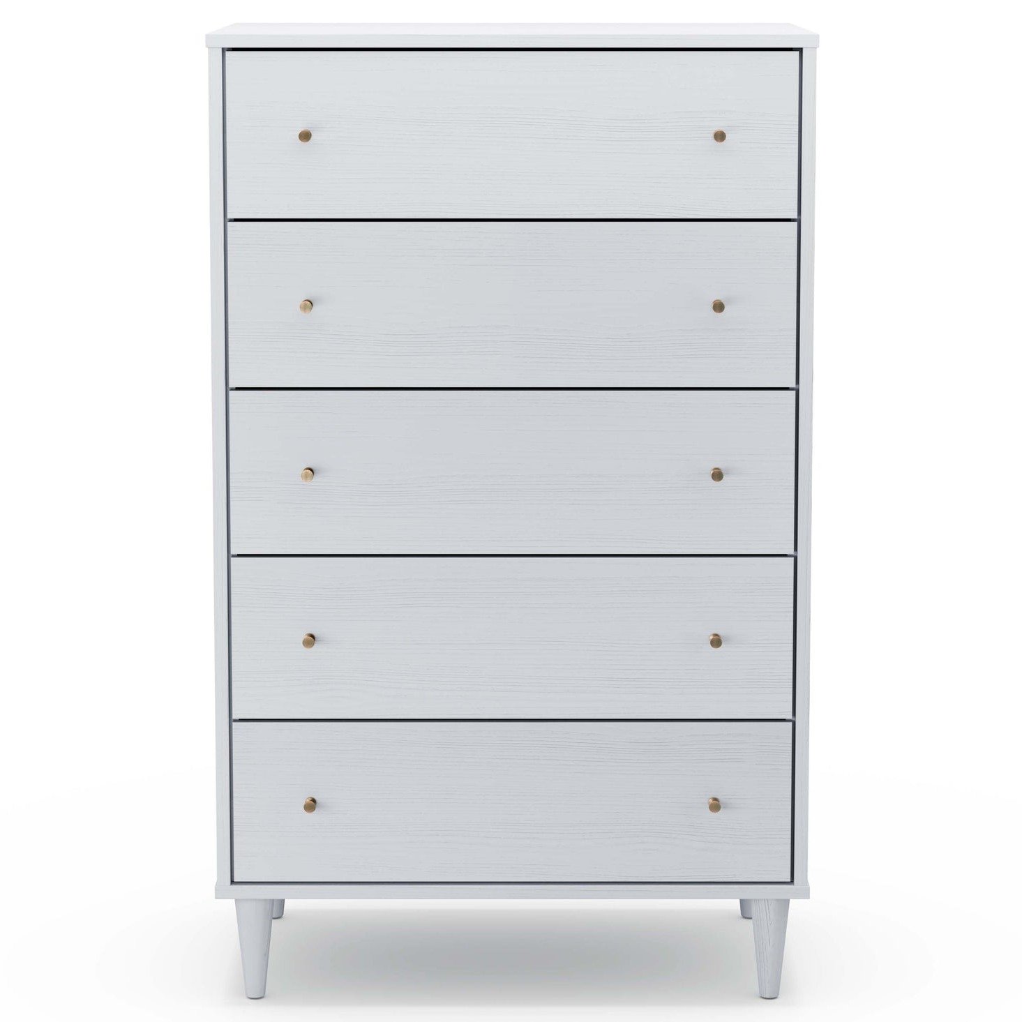 Simple, clean lines for an airy aesthetic and honestly high-quality materials for durability and practicality. This Farmhouse Rustic White Mid Century 5 Drawer Chest is designed in-house to highlight these principles of mid-century modern design. The iconic cone shaped legs are built of sturdy eucalyptus wood. The simple details of this piece won't stand out at first, but will complement many modern or contemporary design styles; and a closer look will reveal an honestly high-quality finish.