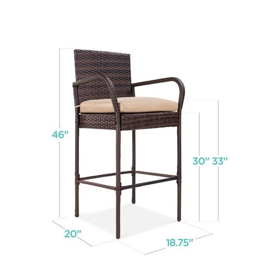 Extra Plush Seat Cushions and extreme comfort make this Set of 2 Brown Indoor/Outdoor Wicker Bar Stools w/ 2 Tan Cushions a prefect addition to any home! 30-inch-high seats make these stools the perfect fit for any standard bar top whether it's in the backyard or the kitchen. Highly durable, weather-resistant wicker covers an iron frame while resisting fading and wear from the sun and rain. Our wide-seated chairs redefine comfort with curved backrests and high armrests that let you lounge without confinement