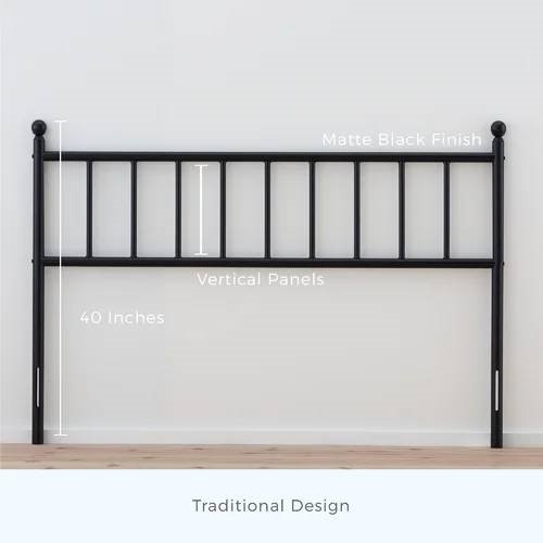 This Full size Traditional Farmhouse Headboard in Matte Black Metal Finish helps complete your bedroom ensemble, with its sleek shape and traditional design. It's made from metal in a black matte finish, and it has open vertical slats and decorative finials that fit well within your space — no matter the style of your room or its color palette. This headboard is 40" tall when measured with both legs. Plus, you can easily mount it to your bed frame — all hardware and plates included.