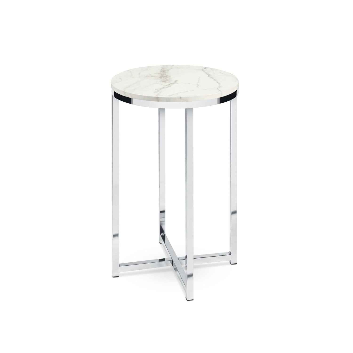 Round Cross Leg Design Coffee Side Table Nightstand with Faux Marble Top White/Chrome Round Cross Leg Design Coffee Side Table Nightstand with Faux Marble Top White/Chrome