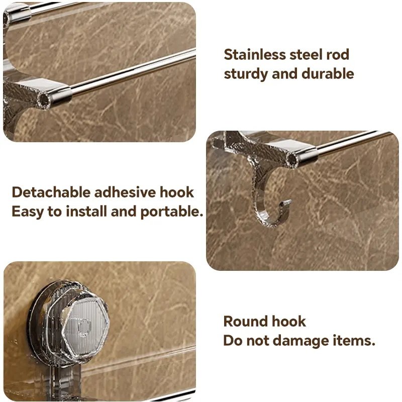 Product Description:The Hassle-Free Way to Organize Your Bathroom – No Drilling, No Damage! This innovative suction cup towel rack provides double-bar storage without screws or permanent installation. The heavy-duty suction cups and rust-resistant metal rods keep towels neatly hung while adding a modern touch to any bathroom. ✔ Strong Suction Cups – Holds up to 11 lbs (no drilling required)✔ Dual Hanging Bars – Space for 4-6 towels (adjustable spacing)✔ Rust-Proof Metal Rods – Durable stainless steel/aluminum construction✔ Non-Slip Design – Textured grips prevent sliding✔ Versatile Placement – Works on tiles, glass, or mirrors✔ Easy Installation – Attaches in seconds