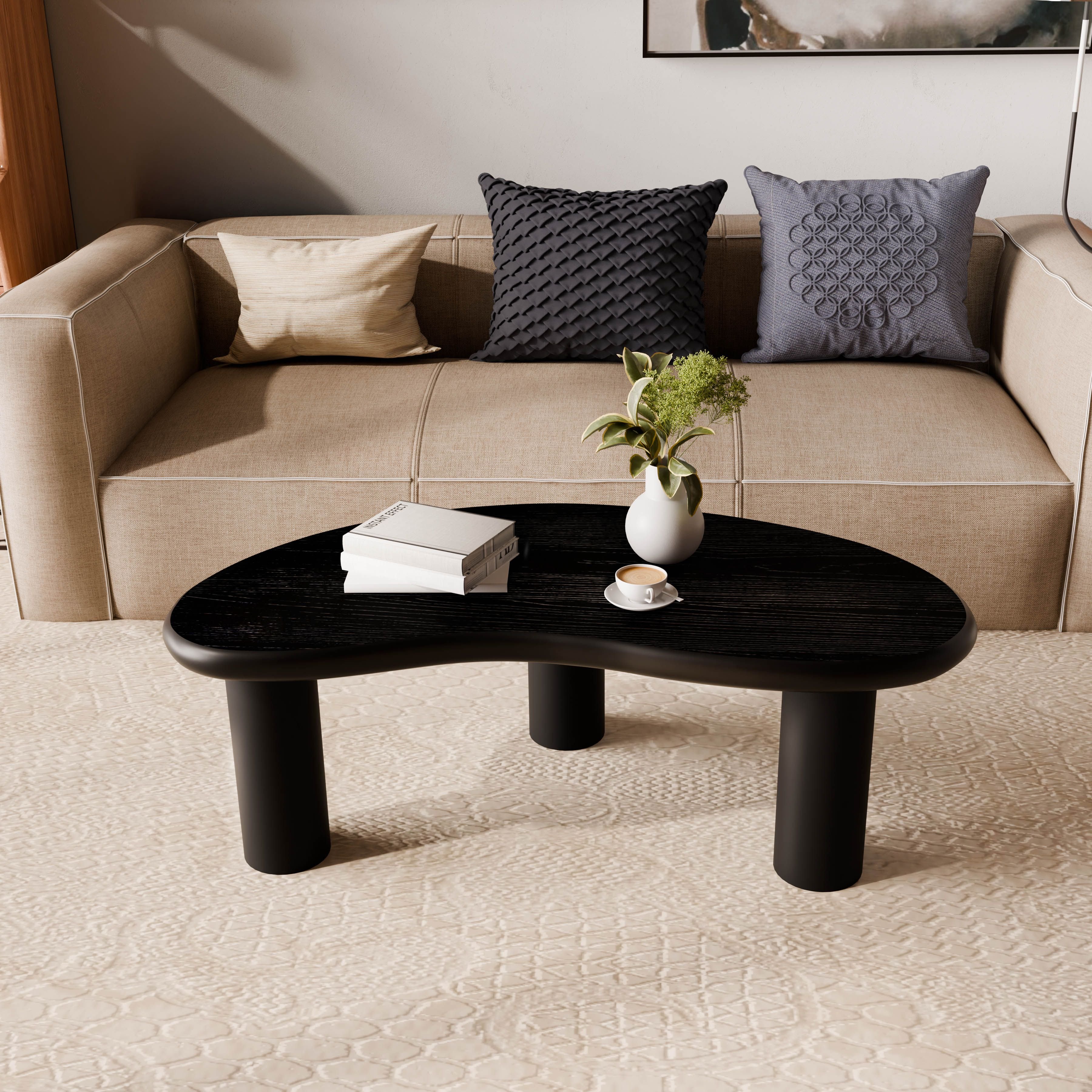 Infuse your living space with an artistic touch with this uniquely designed coffee table. Its organic, bean-shaped top, embellished with a distinctive embossed wood grain, embodies the modern wabi-sabi aesthetic. Crafted from solid wood in a deep charcoal black finish, its thick profile and rounded edges offer both durability and comfort. Whether you're enjoying your morning coffee or displaying your favorite books, this versatile table becomes a sculptural piece that combines practicality and beauty. Its simple design and sturdy construction make it the perfect addition to any modern, Japanese, or minimalist home. Assembly is simple.