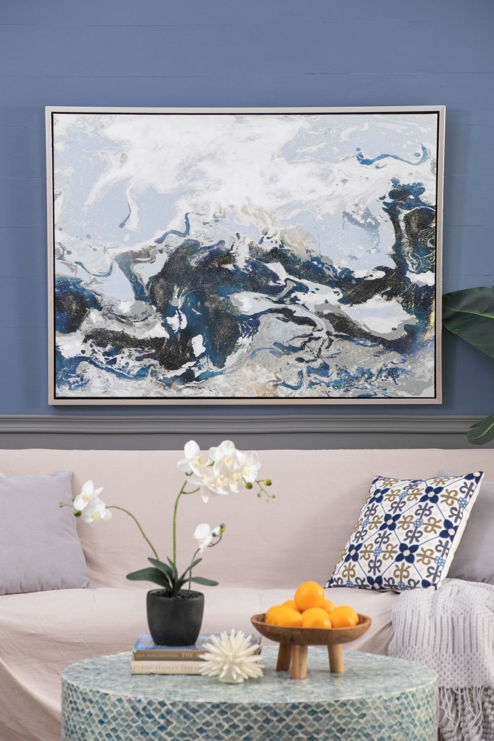Capturing the tidal waves of the sea, our Cerulean Seas Wall Art portrays the crashing waves as if you sitting right there as they break. Resembling the foam the placement of the white is perfect against the shades of blue, showing the different depths of the water. Style this 80% hand painted with oil paints in your coastal getaway for your customers.