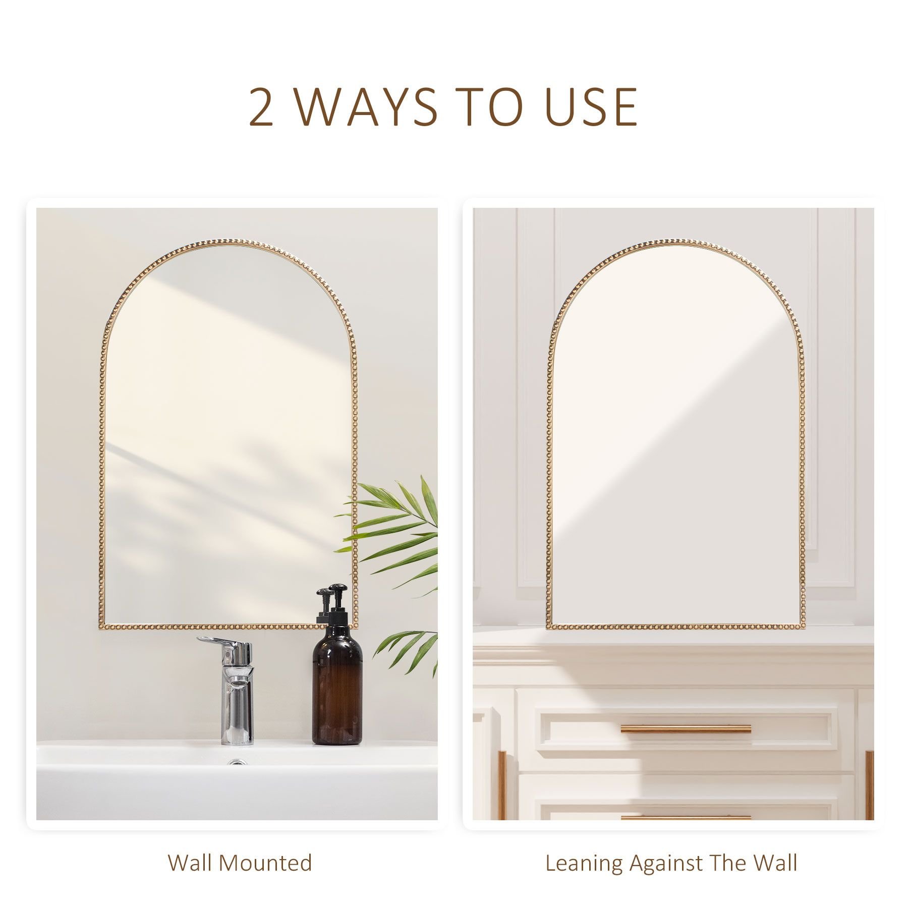 1.Elevate your decor with our Beaded Border Metal Mirror featuring a rounded arch shape, intricate beaded design, and antique dark gold finish. Its sleek silhouette adds an artistic touch to any space